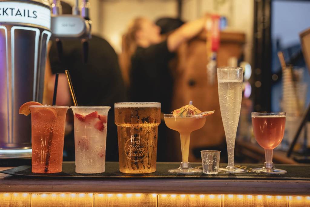 High quality, branded, reusable polycarbonate glasses (not the flimsy disposable type). Each drink has its own glass type i.e. Pint, Flutes, Cocktails, Highball, Wine, Shot etc…